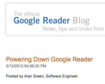 As you’ve probably heard by now, Google is shutting down Google Reader, the service that allowed folks to follow various websites and other news sources via RSS subscription. Here’s their announcement: http://googlereader.blogspot.com/2013/03/powering-down-google-reader.html.